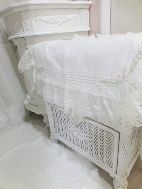 澄みきった甘い香りのそよ風のようなローンフリル、どこまでも可憐な小花とリボンローズ・デコレーション。淡いカラーと相まって主張しすぎずあくまで可憐なのがこの子の魅力。外がどんなに寒くても、いつもふんわりと春を感じさせるようなやさしい寝室、インテリア。