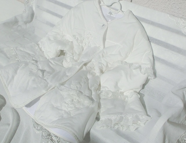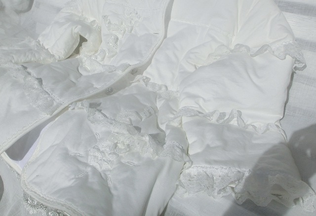 細やかなピンタックに幾種類ものレース飾り。細部まで見惚れるような美しさ。