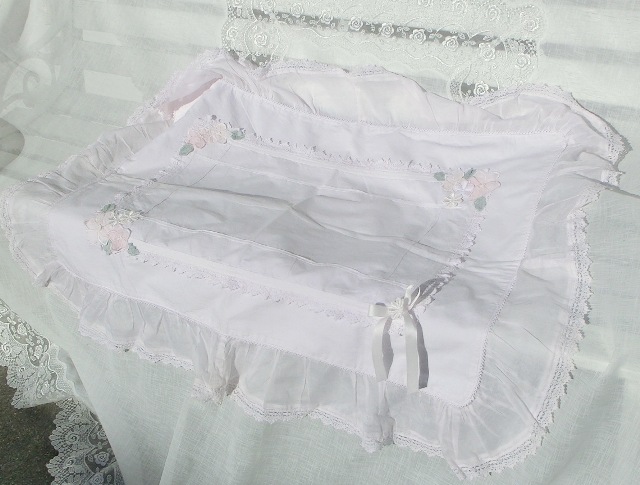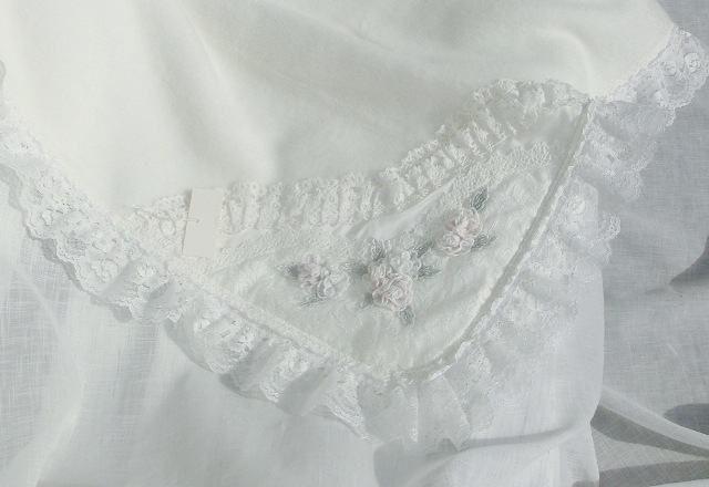 ホワイトピンクカラーのローン地に、ボリュームたっぷりのフリフリレース、咲きほこるバラ。