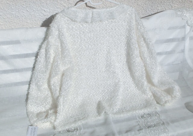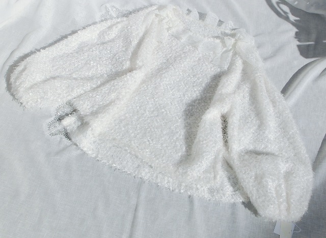フェザー・ヤーンとチュール・レースの白いパフ・スリーブ トップス 最上級カシミア100 ギャザーフリルスタイル ボリューム・マフ オフホワイト
