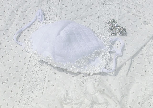 ホワイトキルティングマスクはひもの調節可能、鼻部分ワイヤー入りで快適フィット、フィルターポケットつき(不織のフィルターはもちろんアイスシートなども入れられるので夏場にとってもうれしい!)と超・高性能で、もちろん他にはないロマンティック・デザインでRose