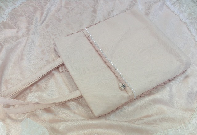 裏はパールデコレーションがきらめくシュガーピンクモアレ風素材。ファスナーつきの大きなポケット・・・かなり重宝いたします(*^-^*)