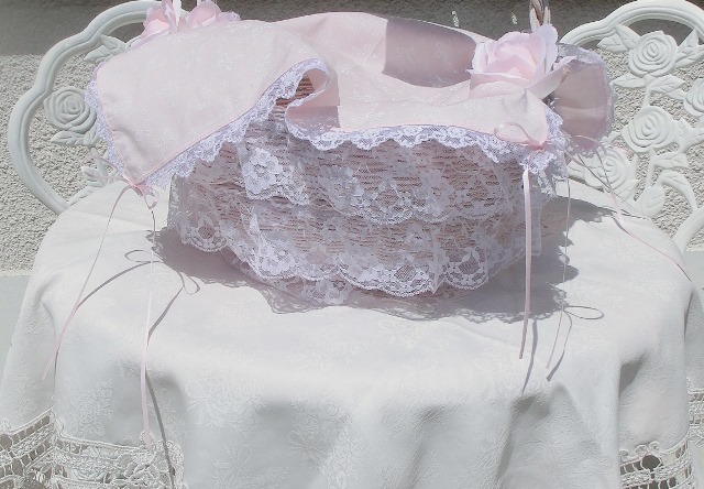 あわーいピンクに白いリボン柄がいーーっぱい。 トリミングはホワイトピンクカラーのバラ刺繍チュール、四隅にはピンクのおリボン♪