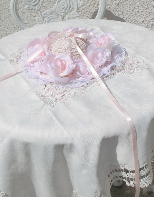 ホワイトピンクカラーのオリジナルの「麦わら帽子(天然ストロー100)」に、ピンクのリボン通しがとびきりメルヘンなレースをあしらって(o^^o)