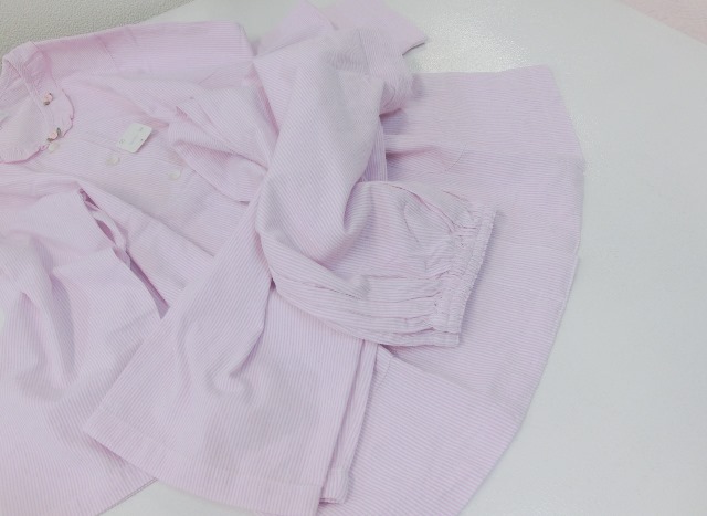 入荷数わずか。お早めに。ベビーピンク地に白ストライプ、フリルなお襟とポケットには愛らしい巻きバラ。