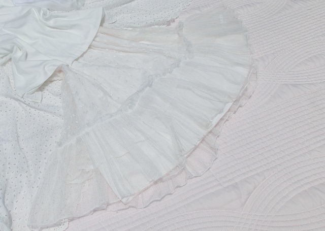 立ちフリルのギャザーでふわっとチュチュスタイルに。ウエストゴムで快適、見た目もキレイなウエスト・デザイン。