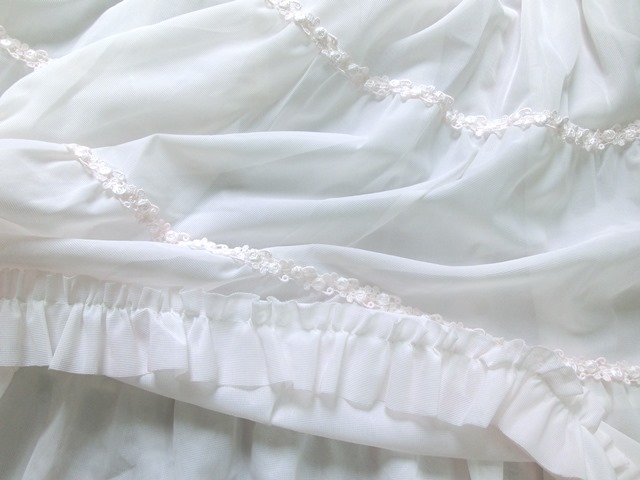 まるで綿菓子のようなふわふわの上質チュール(ポリエステル)の二枚重ね仕様、裾のフリルは可憐でいて上品。一段目と二段目に贅沢にあしわれたつるバラブレード。