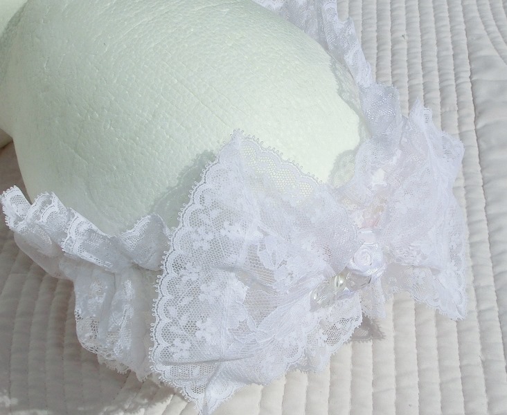 大きなレースリボンのフロントには巻きバラ、パール、クリアビーズが飾られ、清楚にキラキラ。