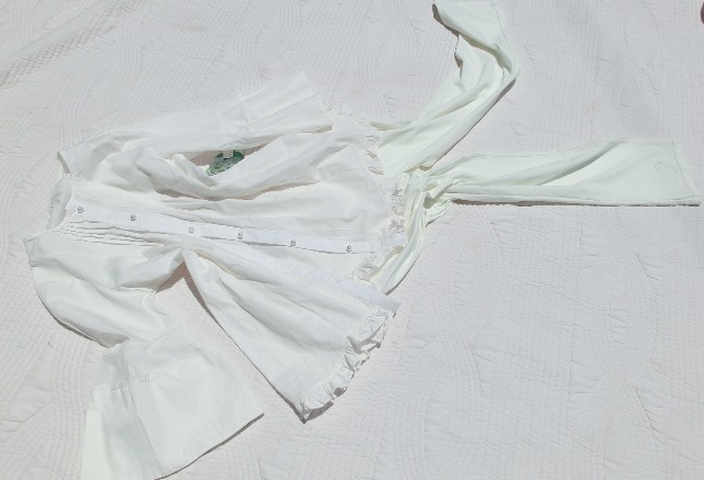 裾フリル、ピンタック、7分のアントワネット・スリーブがステキでロマンティックなチュニックブラウス、パールボタンをあければ羽織にもなるうれしいアイテムです!