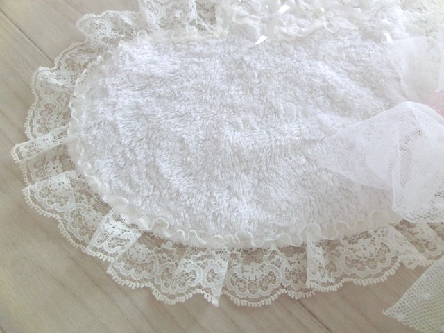 ふわんふわんのタオル地にフリフリレース&大きなチュールリボン。 お花とパールもたっぷりと(#^.^#)