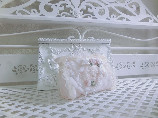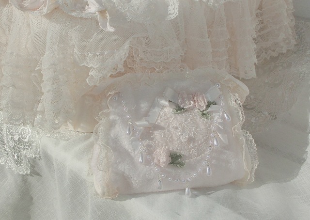 ふっくらパイル地にシャンデリア・パール、ピンクのお花やリボンが小さな花園を連想させるレースメーカー製 プティ・ポーチ 薄ピンク 9,790円税込