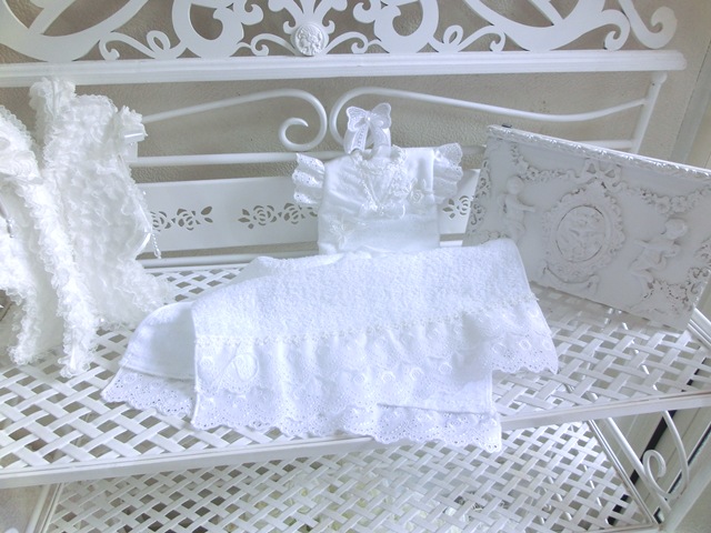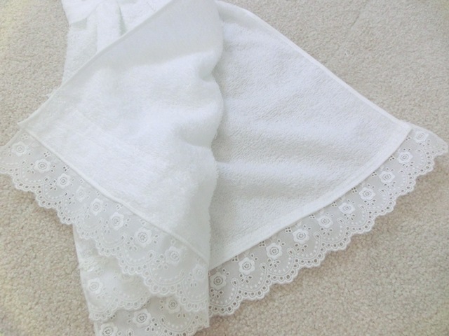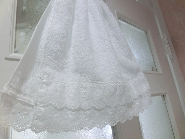 タオルもハンガーも手洗い可能タオルは二重になっており、裾にはかわいらしいアイレットレースが二段で。