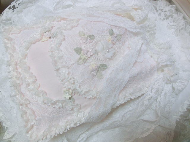 総レースをかぶせた表情豊かな身生地に、ハンドメイドの可憐なお花畑、そして見事なリボン・アート☆彡