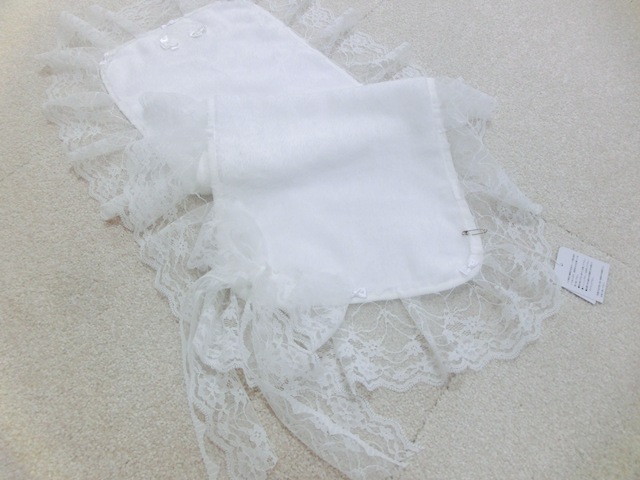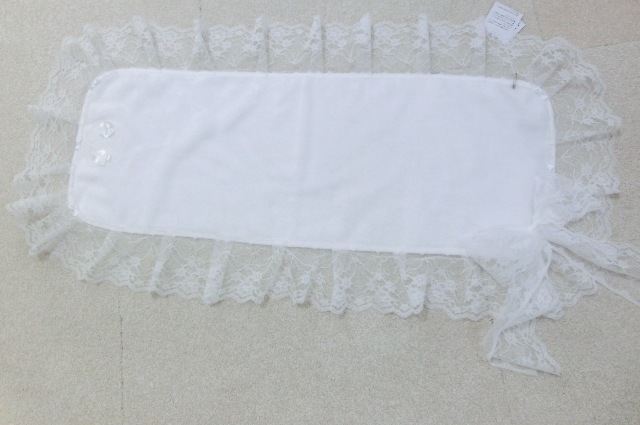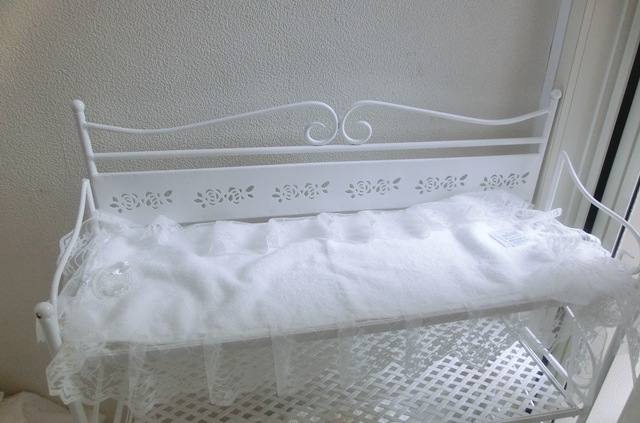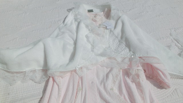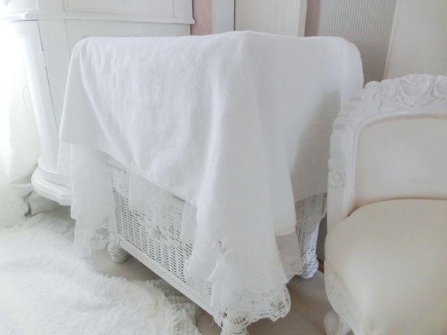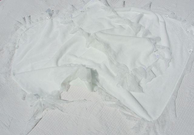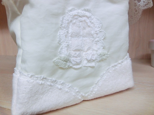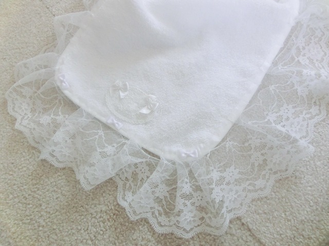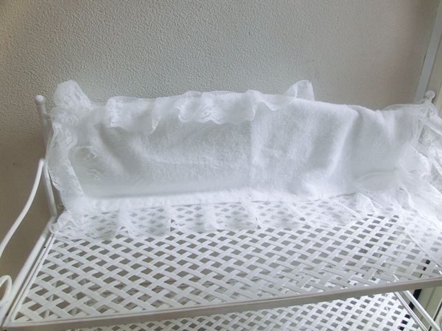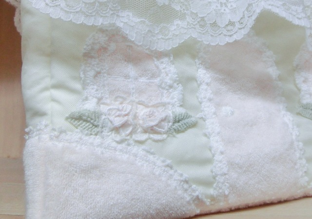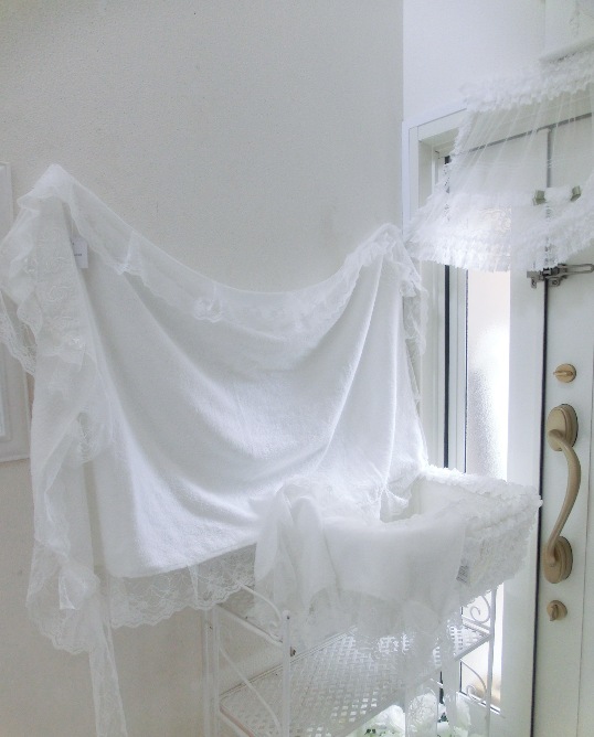 両端にバラ刺繍のコットンレース、ラッセルレース、白いリボン。寒い夜にはこうして肩にかけて(#^^#)