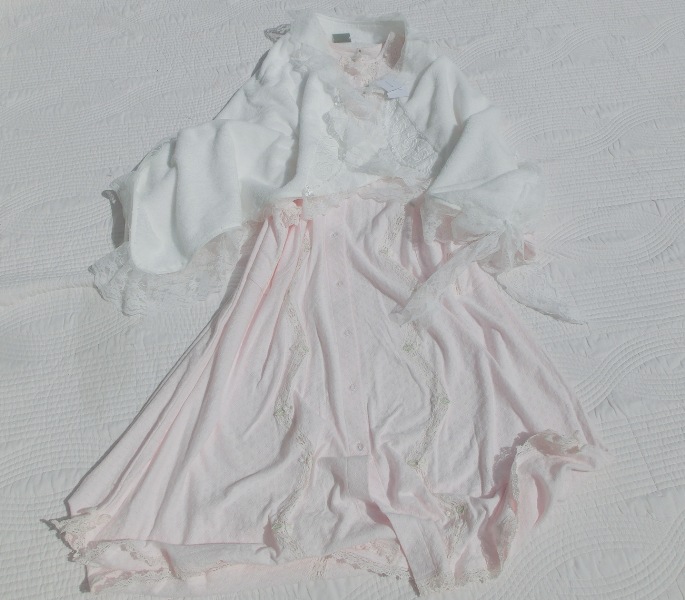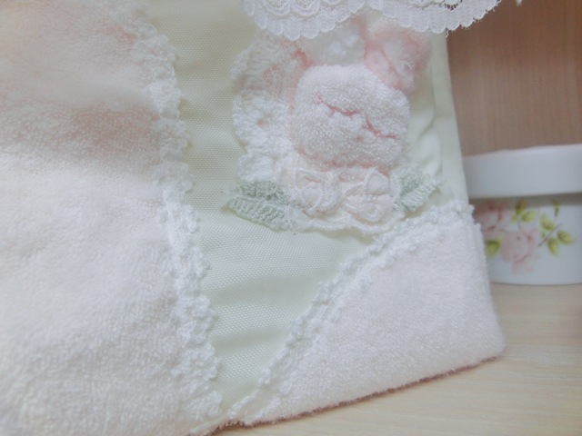 しっかりとしたナイロン地に薄ピンクのパイル地をかぶせ、レースワークや胸おどるモティーフ。