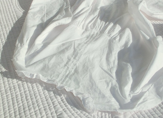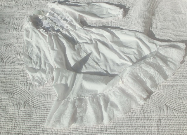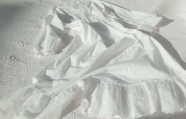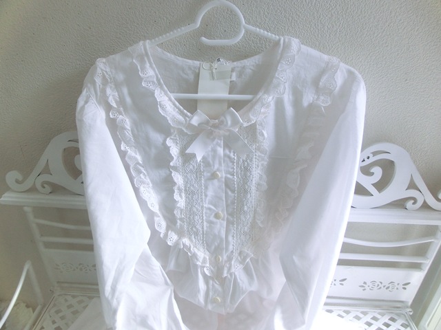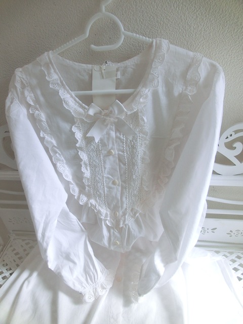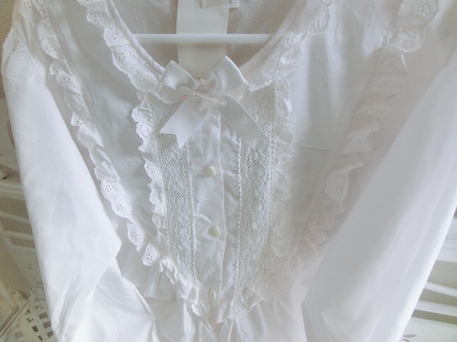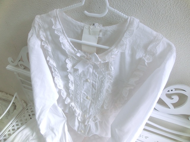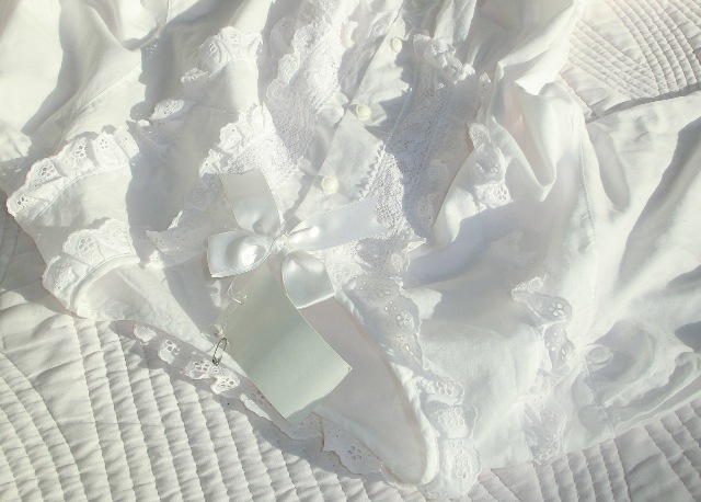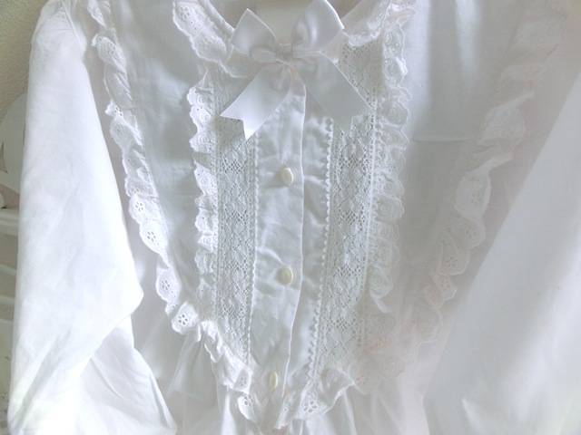 トーション・レース、コットンアイレット・レース2種が可憐に飾られ、トップにはサテンのリボン。