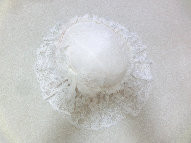 ふっくらと仕上げられた球状スタイルに、総レース重ね、波うつチュール―ス飾り、おそろいのリボンに美しい花ブローチつき。
