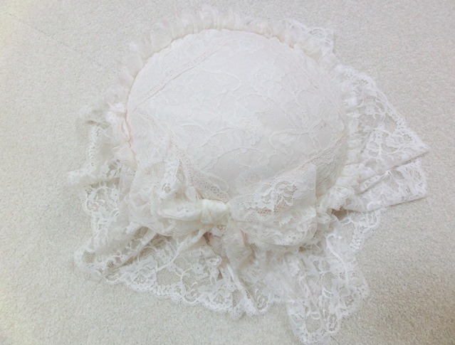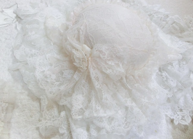 留め具はなし。ふわりと肩にのせるだけでずれ落ちにくいスタイルになっておりますが(私物を数時間肩にかけて動いていましたがずれ落ちなしでした♪)、お手持ちの小さなブローチで留めていただいてもステキですよ。後ろ姿を夢夢しく飾る、ギャザーをよせてリボン型になったフロントに並んだレース飾りと夢モティーフ。リボン、花、パール♪