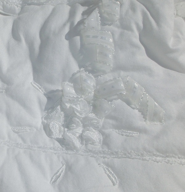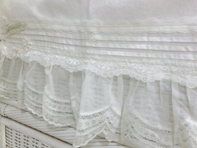 細やかなピンタックに幾種類ものレース飾り。細部まで見惚れるような美しさ。