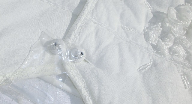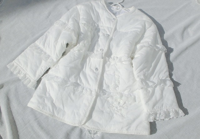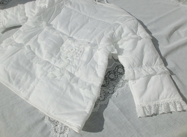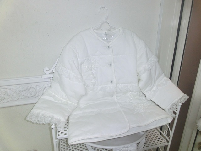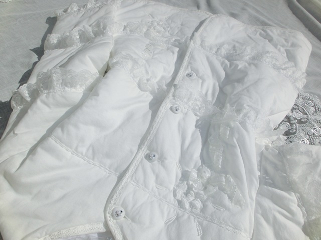 ピンクと素材やスタイルは同じですが、レースがたっぷりと増え、共布のくるみボタンも小さなパールとクリスタルが飾られたジュエル・ボタンにバージョン・アップ。