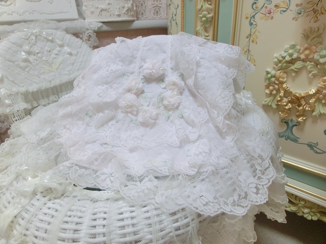 ホワイトピンクカラーのローン地に、ボリュームたっぷりのフリフリレース、咲きほこるバラ。