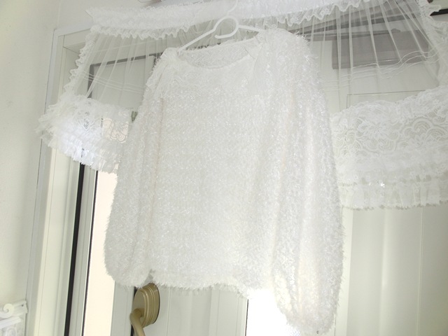 フェザー・ヤーンとチュール・レースの白いパフ・スリーブ トップス 最上級カシミア100 ギャザーフリルスタイル ボリューム・マフ オフホワイト
