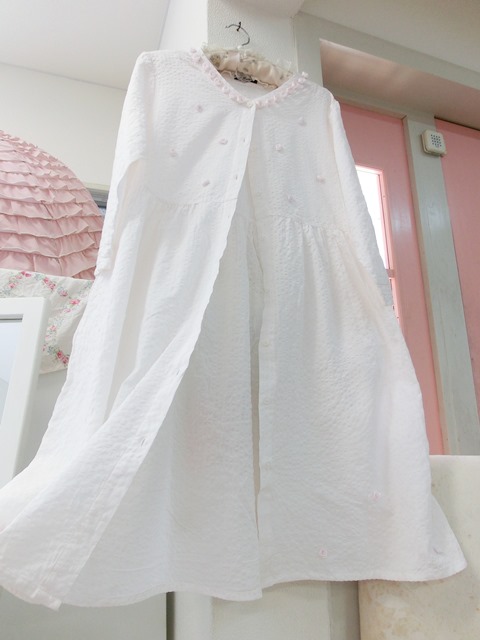 お色はパウダリーピンク。あわーいあわーい白ピンク。溶けいりそうな白ピンクは心を癒やし、ほっとさせてくれるのでお部屋着としてぴったり。ネックラインから裾にまで本体と同じパウダリーピンクの2種類の巻きバラがたーーっぷり。