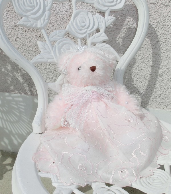 白混じりのホワイト・ピンクのバラがたっくさん連なったあまりにロマンティックな柄でドレス・ベア、トルソー、ドイリー(マルチ・カバー)をおつくりいたしました♪