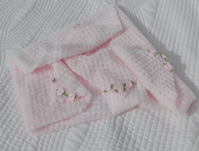 リボンちゃんシリーズ・ラスト2アイテムには、それぞれ、とびきりかわいいシュガーピンク、四隅に巻きバラを三つずつガーランド風にあしらったマルチ・カバー50*50を