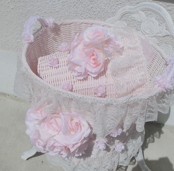 LLLと並べるとやや小ぶりに見えますが、実際には土台のみで直径約26p高さ約32p、そこにレースとバラがつくため、見た目はさらにボリュームがあり、バスケットとしてはけっこう大きなサイズなのです♪